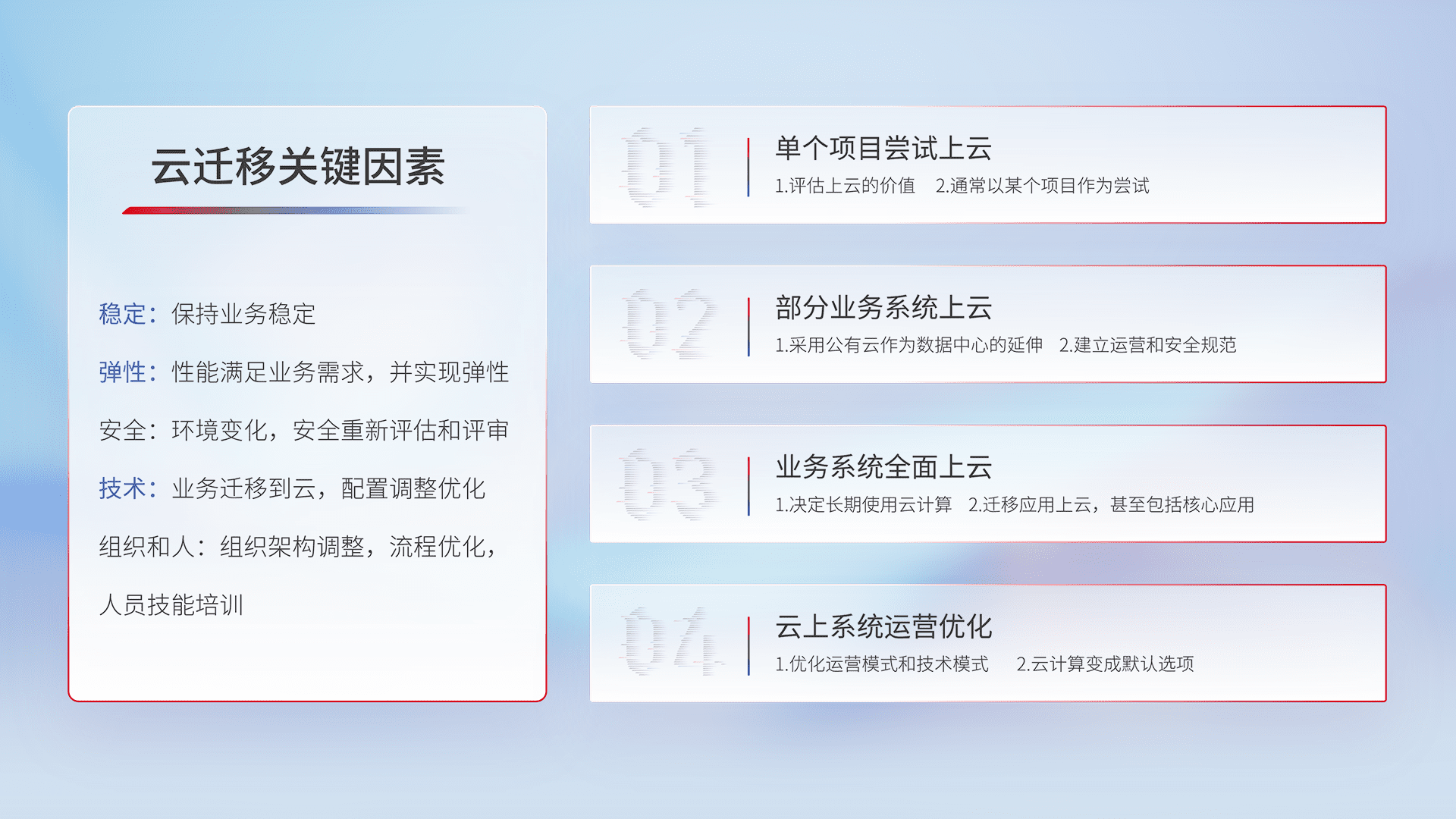 结合实际业务,,,从规划设计、、、云平台选型、、云原生改造、、数据迁移、、、集成交付,,迁移全过程为客户识别最佳上云路径,,做好风险识别管理,,设计网络架构、、身份权限、、、、安全审计合规、、操作审计、、、日志审计、、监控告警策略、、多站点容灾设计等,,,对云上基础设施进行整体规划,,提升IT治理水平,,,以满足弹性、、高可用、、高性能的需求。。。